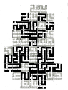En 1996 à Ivry sur seine avec le concours des services des espaces verts de la ville j’ai conçu et réalisé une « structure/sculpture » métallique destinée à accompagner une glycine dont l’ancien support était ruiné. En construisant cette structure constituée de barres carrées j’y découvrit une façon de cube ou les pleins étaient équivalents aux vides. J’ai développé, dans mon atelier de la rue de la voute à Paris, trois modèles sur ce principe à propos des arêtes de cubes centrés et dont les six face comportaient également un centre. Je me donnais pour contrainte de faire passer ces barres de 8 cm de coté par tous les points de cette figure en respectant cette règle des vides équivalents aux pleins.